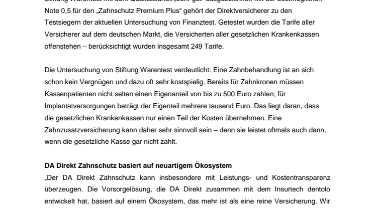 „Der DA Direkt Zahnschutz kann insbesondere mit Leistungs- und Kostentransparenz überzeugen. Die Vorsorgelösung, die DA Direkt zusammen mit dem Insurtech dentolo entwickelt hat, basiert auf einem Ökosystem, das mehr ist als eine reine Versicherung. Wir verbinden den klassischen Versicherungsschutz mit Servicekomponenten aus der modernen zahnmedizinischen Versorgung“, sagt Christian Brodhun, Versicherungsexperte bei DA Direkt. „Wir bieten zudem die Möglichkeit die Rechnungsabwicklung für den Versicherten zu übernehmen und organisieren unter anderem einen Zahnarzttermin innerhalb von zehn Werktagen. Unsere Kunden können auf eine persönliche Beratung zurückgreifen – vor, während und nach der Behandlung.“
