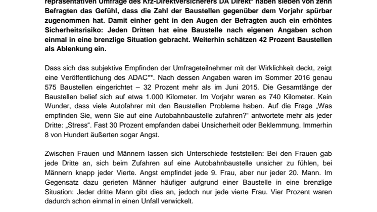 • Repräsentative Studie: Autofahrer sehen sich durch Baustellen gefährdet
