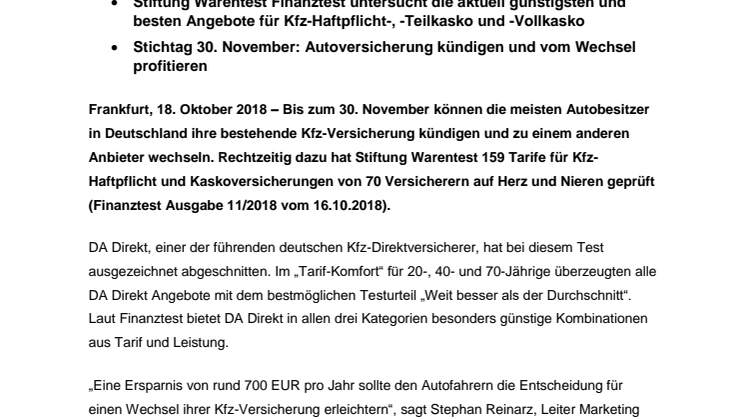 • Kfz-Versicherung: DA Direkt überzeugt mit Bestnoten im direkten Vergleich mit 70 Versicherern