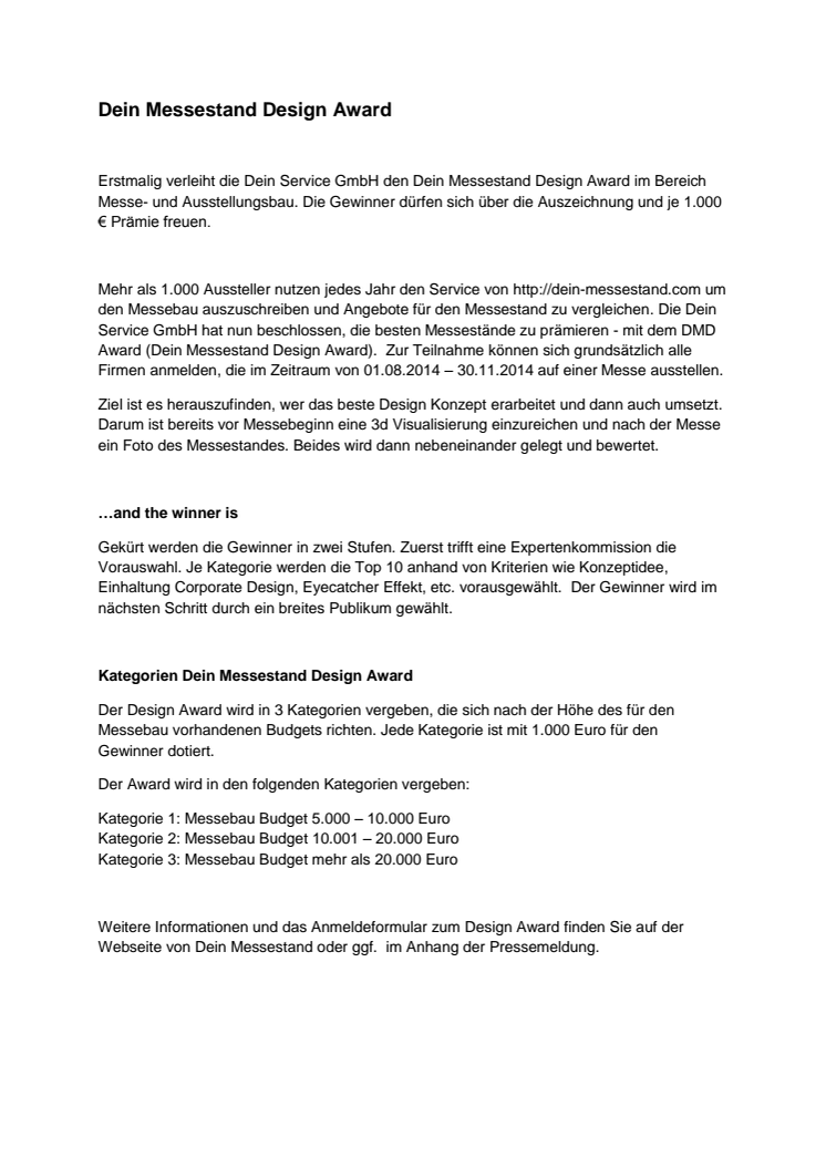 Erstmalig verleiht die Dein Service GmbH den Dein Messestand Design Award im Bereich Messe- und Ausstellungsbau. Die Gewinner dürfen sich über die Auszeichnung und je 1.000 € Prämie freuen.