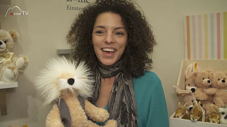 Messe.TV Moderatorin hält den Teddybär Einstein von Steiff. Messe.TV Motivbild zur Spielwarenmesse 2020.