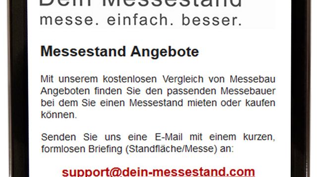 Doch so lange sollen die Nutzer des weltweit agierenden Anbieters für Ausschreibungen im Bereich Messebau und Ladenbau nicht warten müssen. Die Dein Service GmbH schickt mit der Website www.messestand.mobi eine für mobile Geräte optimierte Website ins Rennen. So ist es Messeausstellern künftig auch unterwegs übersichtlich und komfortabel möglich, Angebote für den Messestand einzuholen und ein passendes Messebauunternehmen zu finden.