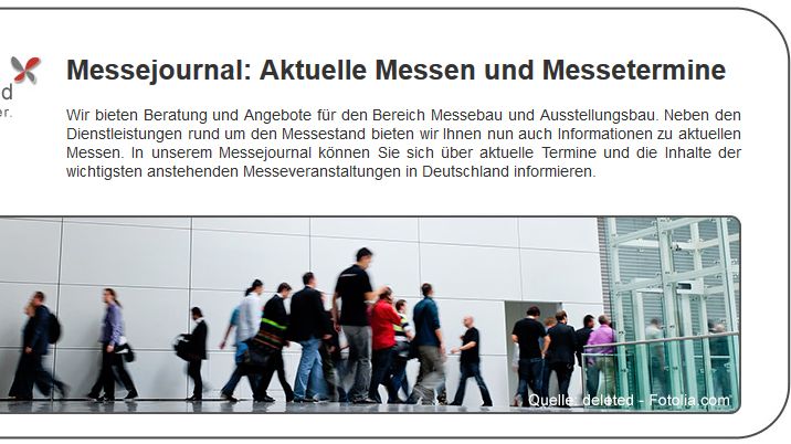Dein Messestand, seit vielen Jahren als Serviceanbieter für den Bereich Messebau und Ausstellungsbau bekannt, erweitert nun sein Angebot. Berichte mit Terminen und Kurzprofilen zu anstehenden Messeveranstaltungen sollen gleichermaßen Ausstellerfirmen und Messebesucher über wichtige Fachmessen und Verbrauchermessen in Deutschland informieren. Wer stets über neu eingestellte Artikel im Messejournal von Dein Messestand in Kenntnis gesetzt werden möchte, kann mit einem Like der Facebook Seite immer auf dem Laufenden bleiben. In der Startphase stehen die deutschen Messestandorte wie Berlin, Frankfurt, Hannover, Köln oder München im Fokus. Im späteren Verlauf wird auch eine Einarbeitung wichtiger Messen an Standorten in der Schweiz und Österreich erfolgen.