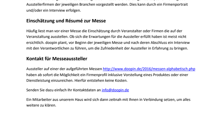 Aussteller auf einer der aufgeführten Messen http://www.doopin.de/2016/messen-alphabetisch.php haben ab sofort die Möglichkeit ein Firmenprofil inklusive Vorstellung eines Produktes oder einer Dienstleistung einzureichen. Hierfür entstehen keine Kosten.
