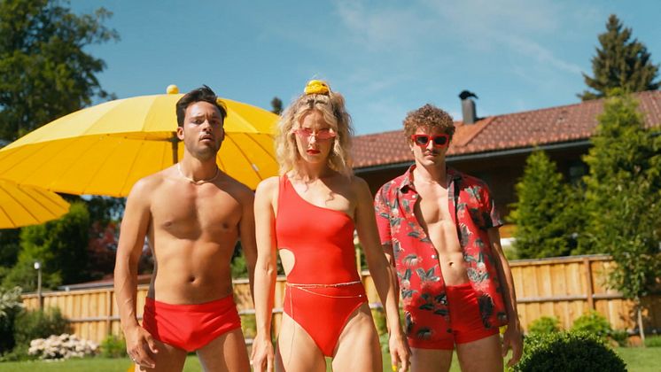 POOL Man - Frau mit Badeanzug und Männer mit Badehose im Garten