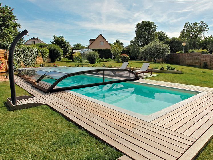 Poolüberdachung Desjoyaux halboffen tagsüber bei schönem Wetter im Garten