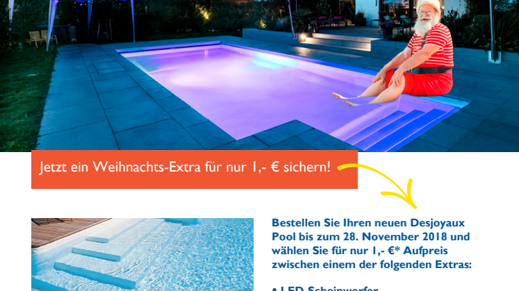 * Ein Angebot der Desjoyaux Pools GmbH. Gültig bei verbindlicher Bestellung eines Desjoyaux Pools bis 28. November 2018 und Lieferung bis spätestens 12. Dezember 2018. Pro Poolbestellung ein Extra der oben genannten zum Aufpreis von 1,- €. Nicht im Angebot enthalten: Transport und Montage. Nicht kombinierbar mit anderen Aktionen und nur gültig bei teilnehmenden Händlern.