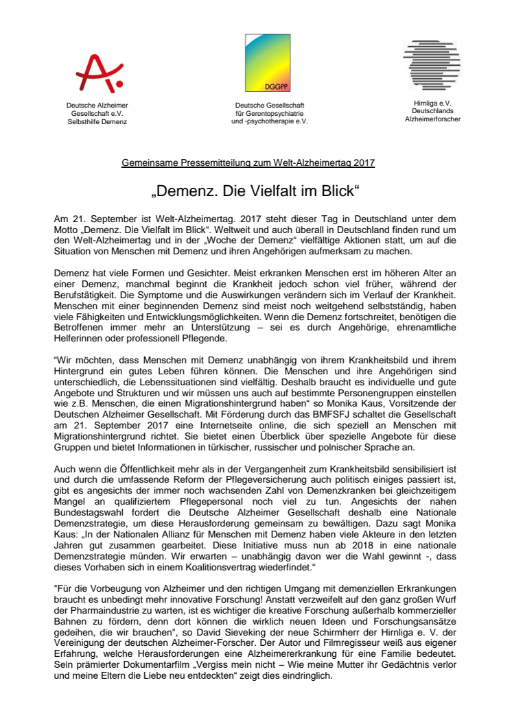 „Demenz. Die Vielfalt im Blick“ - Gemeinsame PM von DAlzG, DGGPP und Hirnliga zum Welt-Alzheimertag