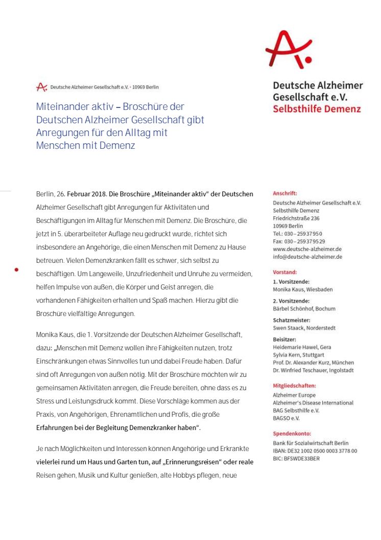 Miteinander aktiv – Broschüre der Deutschen Alzheimer Gesellschaft gibt Anregungen für den Alltag mit Menschen mit Demenz