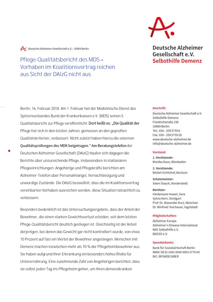 Pflege-Qualitätsbericht des MDS – Vorhaben im Koalitionsvertrag reichen aus Sicht der DAlzG nicht aus