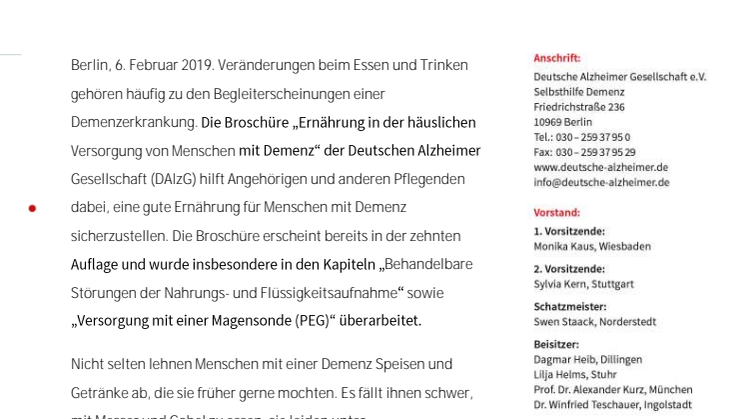 Die Broschüre „Ernährung in der häuslichen Versorgung Demenzkranker“; 10. Auflage 2019, 56 Seiten, ist für 4 Euro im Online-Shop der Deutschen Alzheimer Gesellschaft erhältlich.