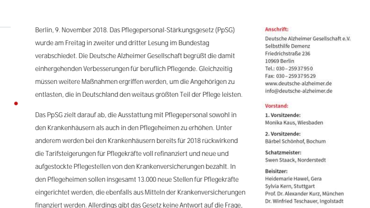 Deutsche Alzheimer Gesellschaft zur Verabschiedung des Pflegepersonal-Stärkungsgesetzes