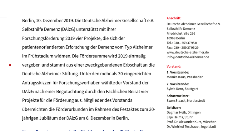 Berlin, 10. Dezember 2019. Die Deutsche Alzheimer Gesellschaft e.V. Selbsthilfe Demenz (DAlzG) unterstützt mit ihrer Forschungsförderung 2019 vier Projekte, die sich der patientenorientierten Erforschung der Demenz vom Typ Alzheimer im Frühstadium widmen. Die Fördersumme wird 2019 einmalig vergeben und stammt aus einer zweckgebundenen Erbschaft an die Deutsche Alzheimer Stiftung. Unter den mehr als 30 eingereichten Antragsskizzen für Forschungsvorhaben wählte der Vorstand der DAlzG nach einer Begutachtung durch den Fachlichen Beirat vier Projekte für die Förderung aus. Mitglieder des Vorstands überreichten die Förderurkunden im Rahmen des Festaktes zum 30-jährigen Jubiläum der DAlzG am 6. Dezember in Berlin.