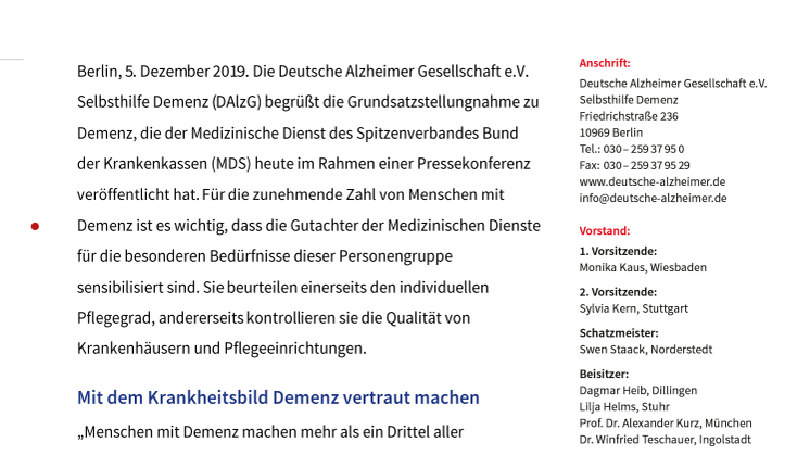 Berlin, 5. Dezember 2019. Die Deutsche Alzheimer Gesellschaft e.V. Selbsthilfe Demenz (DAlzG) begrüßt die Grundsatzstellungnahme zu Demenz, die der Medizinische Dienst des Spitzenverbandes Bund der Krankenkassen (MDS) heute im Rahmen einer Pressekonferenz veröffentlicht hat. Für die zunehmende Zahl von Menschen mit Demenz ist es wichtig, dass die Gutachter der Medizinischen Dienste für die besonderen Bedürfnisse dieser Personengruppe sensibilisiert sind. Sie beurteilen einerseits den individuellen Pflegegrad, andererseits kontrollieren sie die Qualität von Krankenhäusern und Pflegeeinrichtungen.