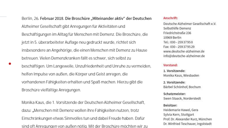 Monika Kaus, die 1. Vorsitzende der Deutschen Alzheimer Gesellschaft, dazu: „Menschen mit Demenz wollen ihre Fähigkeiten nutzen, trotz Einschränkungen etwas Sinnvolles tun und dabei Freude haben. Dafür sind oft Anregungen von außen nötig. Mit der Broschüre möchten wir zu gemeinsamen Aktivitäten anregen, die Freude bereiten, ohne dass es zu Stress und Leistungsdruck kommt. Diese Vorschläge kommen aus der Praxis, von Angehörigen, Ehrenamtlichen und Profis, die große Erfahrungen bei der Begleitung Demenzkranker haben“.