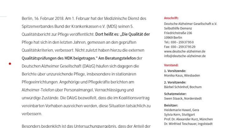 Berlin, 16. Februar 2018. Am 1. Februar hat der Medizinische Dienst des Spitzenverbandes Bund der Krankenkassen e.V. (MDS) seinen 5. Qualitätsbericht zur Pflege veröffentlicht. Dort heißt es: „Die Qualität der Pflege hat sich in den letzten Jahren, gemessen an den geprüften Qualitätskriterien, verbessert. Nicht zuletzt haben hierzu die externen Qualitätsprüfungen des MDK beigetragen.“ Am Beratungstelefon der Deutschen Alzheimer Gesellschaft (DAlzG) häufen sich dagegen die Berichte über unzureichende Pflege, insbesondere in stationären Pflegeeinrichtungen. Angehörige und Pflegekräfte berichten am Alzheimer-Telefon über Personalmangel, Vernachlässigung und unwürdige Zustände. Die DAlzG bezweifelt, dass die im Koalitionsvertrag vereinbarten Vorhaben ausreichen werden, diese Situation tatsächlich zu verbessern.