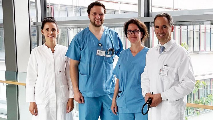 Das Forschungsteam der Studie INTERFAST-MI: Doktorandin Zoe Kefalianakis, Oberarzt Dr. Jochen Dutzmann, Study Nurse Kathrin Ludwig und Klinikdirektor Prof. Dr. Daniel Sedding (v. l. n. r.).