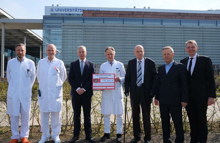 Scheckübergabe (v.l.n.r.): PD Dr. Arnaud Van Linden, OA, Klinik für Herz- und Gefäßchirurgie Universitätsklinkum Frankfurt, Prof. Dr. Dr. Thomas Vogl, Direktor des Instituts für Diagnostische und Interventionelle Radiologie, Universitätsklinkum Frankfurt, Prof. Dr. Thomas Voigtländer, Vorsitzender der Deutschen Herzstiftung, Projektleiter Prof. Dr. Thomas Walther, Direktor der Klinik für Herz- und Gefäßchirurgie am Universitätsklinikum Frankfurt, Erich Garz, Vorstandsmitglied der Horst-Haas-und-Irene-Haas-Scheuermann-Stiftung und deren Vorstandsvorsitzender Josef Weyrich, Prof. Dr. Jürgen Graf, Ärztlicher Direktor und Vorstandsvorsitzender des Universitätsklinikum Frankfurt. (Copyright: Universitätsklinikum Frankfurt)