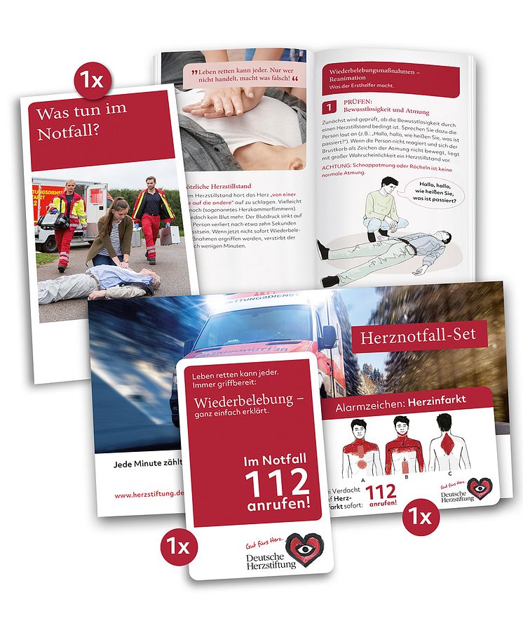 Das kostenfreie Herznotfall-Set der Deutschen Herzstiftung zum richtigen Verhalten bei Herzinfarkt und plötzlicher Bewusstlosigkeit wegen eines Herz-Kreislauf-Stillstands.