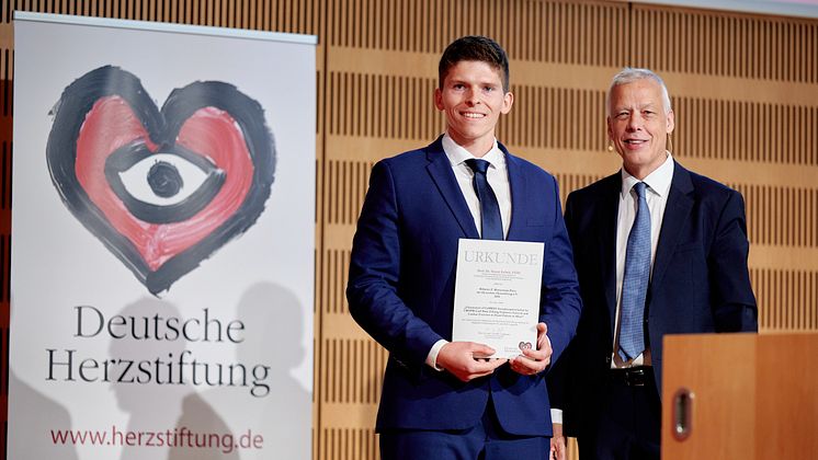 Ausgezeichneter Herzforscher: Prof. Dr. Simon Lebek (l.) bei der Entgegennahme der Urkunde des Wilhelm P. Winterstein-Preises in Frankfurt am Main Ende Juni. Die Urkunde überreichte Prof. Dr. Thomas Voigtländer, Vorsitzender der Deutschen Herzstiftung.