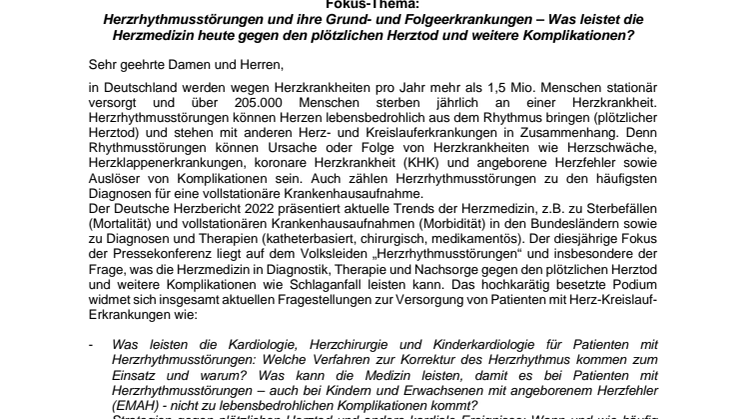 Der Deutsche Herzbericht 2022 präsentiert aktuelle Trends der Herzmedizin, z.B. zu Sterbefällen (Mortalität) und vollstationären Krankenhausaufnahmen (Morbidität) in den Bundesländern sowie zu Diagnosen und Therapien (katheterbasiert, chirurgisch, medikamentös). Der diesjährige Fokus der Pressekonferenz liegt auf dem Volksleiden „Herzrhythmusstörungen“ und insbesondere der Frage, was die Herzmedizin in Diagnostik, Therapie und Nachsorge gegen den plötzlichen Herztod und weitere Komplikationen wie Schlaganfall leisten kann. Das hochkarätig besetzte Podium widmet sich insgesamt aktuellen Fragestellungen zur Versorgung von Patienten mit Herz-Kreislauf-Erkrankungen wie: