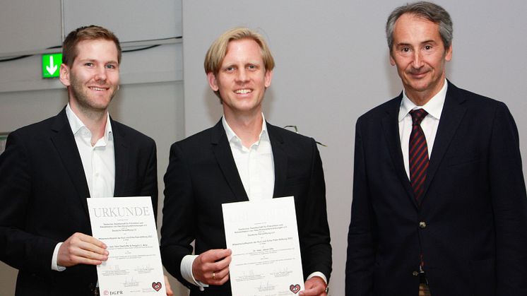 Preisträger: Dr. med. Felix Oberhoffer, Abt. Kinderkardiologie und Pädiatrische Intensivmedizin, Klinikum der Universität München, Dr. med. Jakob Olfe, Klinik und Poliklinik für Kinderherzmedizin und Erwachsene mit angeborenen Herzfehlern, Universitäres Herz- und Gefäßzentrum Hamburg mit Prof. Dr. Bernhard Schwaab, Past-Präsident der DGPR und Vorstandsmitglied der Deutschen Herzstiftung. Bildnachweis: DGPR/Peter Ritter