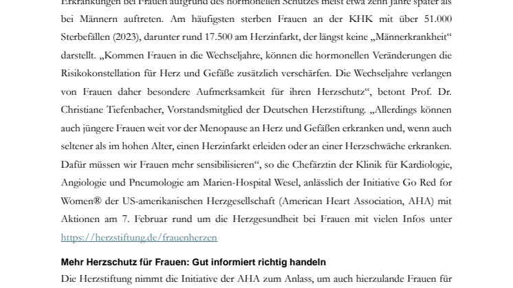 (Frankfurt a. M., 5. Februar 2025) Für Frauen – wie für Männer – sind Herzerkrankungen wie Koronare Herzkrankheit (KHK), Herzschwäche oder Herzrhythmusstörungen der häufigste Grund für Krankenhauseinweisungen und vorzeitigen Tod. Nur dass diese Erkrankungen bei Frauen aufgrund des hormonellen Schutzes meist etwa zehn Jahre später als bei Männern auftreten. Am häufigsten sterben Frauen an der KHK mit über 51.000 Sterbefällen (2023), darunter rund 17.500 am Herzinfarkt, der längst keine „Männerkrankheit“ darstellt. „Kommen Frauen in die Wechseljahre, können die hormonellen Veränderungen die Risikokonstellation für Herz und Gefäße zusätzlich verschärfen. Die Wechseljahre verlangen von Frauen daher besondere Aufmerksamkeit für ihren Herzschutz“, betont Prof. Dr. Christiane Tiefenbacher, Vorstandsmitglied der Deutschen Herzstiftung. „Allerdings können auch jüngere Frauen weit vor der Menopause an Herz und Gefäßen erkranken und, wenn auch seltener als im hohen Alter, einen Herzinfarkt erleiden oder an einer Herzschwäche erkranken. Dafür müssen wir Frauen mehr sensibilisieren“, so die Chefärztin der Klinik für Kardiologie, Angiologie und Pneumologie am Marien-Hospital Wesel, anlässlich der Initiative Go Red for Women® der US-amerikanischen Herzgesellschaft (American Heart Association, AHA) mit Aktionen am 7. Februar rund um die Herzgesundheit bei Frauen mit vielen Infos unter herzstiftung.de/frauenherzen