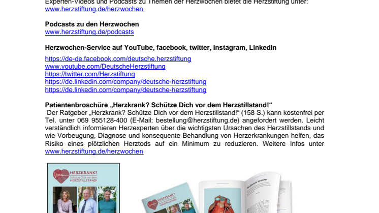 Der Ratgeber „Herzkrank? Schütze Dich vor dem Herzstillstand!“ (158 S.) kann kostenfrei per Tel. unter 069 955128-400 (E-Mail: bestellung@herzstiftung.de) angefordert werden. Leicht verständlich informieren Herzexperten über die wichtigsten Ursachen des Herzstillstands und wie Vorbeugung, Diagnose und konsequente Behandlung von Herzerkrankungen helfen, das Risiko eines plötzlichen Herztods auf ein Minimum zu reduzieren. Überlebende eines plötzlichen Herztods berichten eindrücklich in Patientenportraits. Weitere Infos unter www.herzstiftung.de/herzwochen