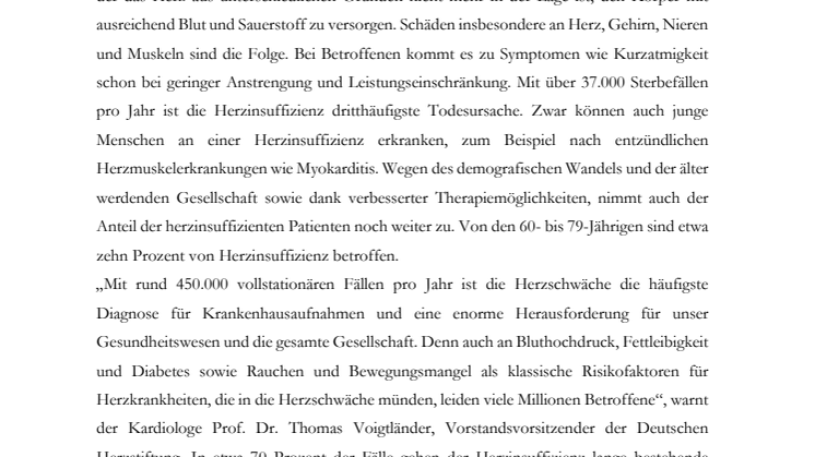 (Frankfurt a. M., 24. Oktober 2024) Das Treppensteigen wird zur Tortur und bei der sonst so erholsamen Bergwanderung kommt man plötzlich nicht mehr mit. Nach Schätzungen leiden hierzulande bis zu vier Millionen Menschen an Herzschwäche (Herzinsuffizienz), bei der das Herz aus unterschiedlichen Gründen nicht mehr in der Lage ist, den Körper mit ausreichend Blut und Sauerstoff zu versorgen. Schäden insbesondere an Herz, Gehirn, Nieren und Muskeln sind die Folge. Bei Betroffenen kommt es zu Symptomen wie Kurzatmigkeit schon bei geringer Anstrengung und Leistungseinschränkung. Mit über 37.000 Sterbefällen pro Jahr ist die Herzinsuffizienz dritthäufigste Todesursache. Zwar können auch junge Menschen an einer Herzinsuffizienz erkranken, zum Beispiel nach entzündlichen Herzmuskelerkrankungen wie Myokarditis. Wegen des demografischen Wandels und der älter werdenden Gesellschaft sowie dank verbesserter Therapiemöglichkeiten, nimmt auch der Anteil der herzinsuffizienten Patienten noch weiter zu. Von den 60- bis 79-Jährigen sind etwa zehn Prozent von Herzinsuffizienz betroffen.