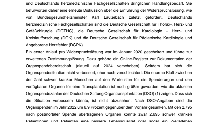 (Frankfurt a. M., 6. Februar 2023) Der deutliche Rückgang der Zahl der Organspenden im Jahr 2022 zeigt: Beim Spenderorganmangel ist in Deutschland kein Ende in Sicht. Alarmiert von diesem negativen Trend mit dramatischen Auswirkungen für die betroffenen schwer kranken Patientinnen und Patienten, darunter auch Kinder, sehen die Deutsche Herzstiftung und Deutschlands herzmedizinische Fachgesellschaften dringlichen Handlungsbedarf. Sie befürworten daher eine erneute Diskussion über die Einführung der Widerspruchslösung, wie von Bundesgesundheitsminister Karl Lauterbach zuletzt gefordert. Deutschlands herzmedizinische Fachgesellschaften sind die Deutsche Gesellschaft für Thorax-, Herz- und Gefäßchirurgie (DGTHG), die Deutsche Gesellschaft für Kardiologie – Herz- und Kreislaufforschung (DGK) und die Deutsche Gesellschaft für Pädiatrische Kardiologie und Angeborene Herzfehler (DGPK).