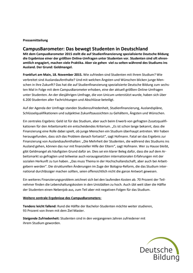 Mit dem CampusBarometer 2015 stellt die auf Studienfinanzierung spezialisierte Deutsche Bildung die Ergebnisse einer der größten Online-Umfragen unter Studenten vor. Studenten sind oft ehrenamtlich engagiert, machen viele Praktika. Aber sie gehen viel zu selten während des Studiums ins Ausland. Der Grund: Geldmangel.