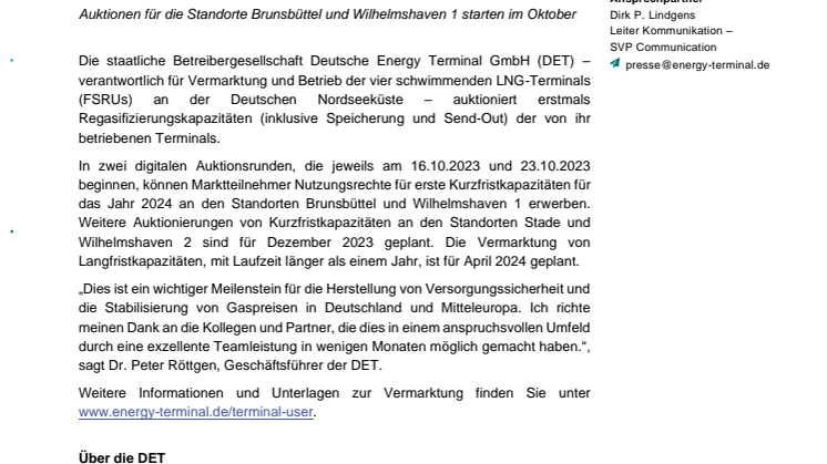 Die staatliche Betreibergesellschaft Deutsche Energy Terminal GmbH (DET) ist verantwortlich für Vermarktung und Betrieb der vier schwimmenden LNG-Terminals an der Deutschen Nordseeküste. Nun auktioniert DET erstmals Regasifizierungskapazitäten (inklusive Speicherung und Send-Out) der von ihr betriebenen Terminals.