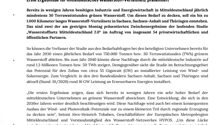 „Die ersten Ergebnisse zeigen, dass sich bereits in wenigen Jahren ein sehr hoher Bedarf der mitteldeutschen Unternehmen an grünem Wasserstoff abzeichnet. Eine Entwicklung, die sich in den 2030er Jahren weiter deutlich beschleunigen wird. Diese Nachfrage wird auch bei einem konsequenten Ausbau der Wind- und Photovoltaik-Potenziale nur zu einem kleineren Teil durch regionale Erzeugung zu decken sein“, betont Jörn-Heinrich Tobaben, Geschäftsführer der Europäischen Metropolregion Mitteldeutschland und Vorstandsmitglied des Wasserstoff-Netzwerkes HYPOS.