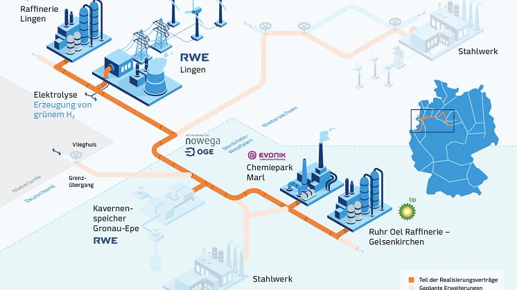 In der Elektrolyseanlage der RWE Generation in Lingen soll mit Hilfe von grünem Strom Wasserstoff erzeugt werden. Die Anlage auf dem Gelände des Gaskraftwerks Emsland soll 2025 in Betrieb gehen und wäre dann weltweit einer der ersten Elektrolyseure mit einer Leistung von 100 MW. Ein Ausbau auf 300 MW in den Folgejahren ist bereits geplant. Auf der Strecke von Lingen über den Chemiepark von Evonik in Marl nach Gelsenkirchen sollen bestehende Leitungen des heutigen Erdgasnetzes von Nowega und OGE sowie bestehende Leitungen von Evonik auf den Transport von Wasserstoff umgestellt werden. Für die Anbindung von Erzeugung und Abnehmern werden darüber hinaus kürzere Leitungsabschnitte neu gebaut. In den bp Raffinerien in Gelsenkirchen und Lingen sowie im Chemiepark Marl soll grüner Wasserstoff im Produktionsprozess sowie als Rohstoff eingesetzt werden, um bisher verwendeten grauen Wasserstoff, bei dessen Erzeugung CO2-Emissionen anfallen, zu ersetzen. Für die chemische Industrie wiederum dient Wasserstoff nicht primär zur Energieerzeugung, sondern ist insbesondere als Rohstoff für zahlreiche Produkte wichtig.
