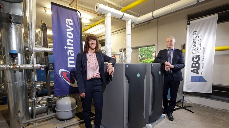 Mainova-Vorständin Diana Rauhut und Frank Junker, Vorsitzender der Geschäftsführung der ABG FRANKFURT HOLDING, besuchten die Heizzentrale in der Jaspertstraße, in der zwei wasserstofffähige Brennstoffzellen zum Einsatz kommen. Foto: Mainova AG