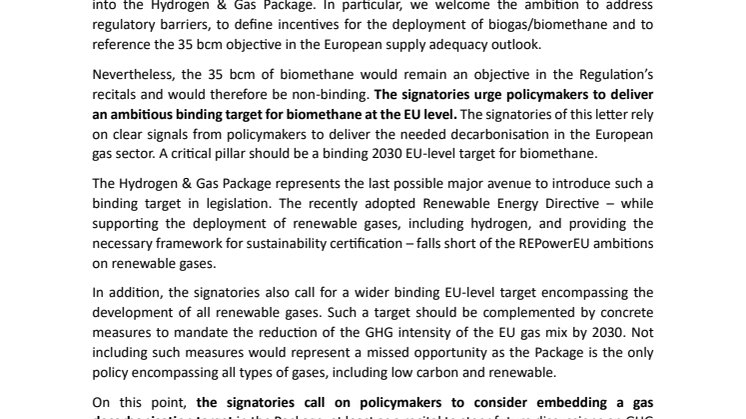 Darüber hinaus fordern die Unterzeichner ein umfassenderes verbindliches Ziel auf EU-Ebene, das die Entwicklung aller erneuerbaren Gase einschließt. Ein solches Ziel sollte durch konkrete Maßnahmen ergänzt werden, die eine Verringerung der Treibhausgasintensität des EU-Gasmixes bis 2030 vorschreiben. Der Verzicht auf solche Maßnahmen wäre eine verpasste Gelegenheit, da das Paket die einzige Politik ist, die alle Arten von Gasen umfasst, einschließlich kohlenstoffarmer und erneuerbarer Gase.