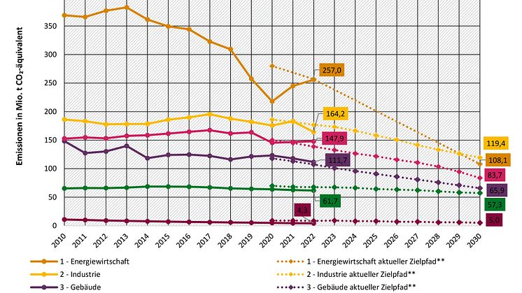 Der Gebäudesektor bleibt nicht das einzige Problem. Im Verkehr wurden laut dem veröffentlichten Datensatz im Jahr 2022 rund 148 Millionen Tonnen CO₂-Äquivalente ausgestoßen. Damit liegen die Treibhausgasemissionen dieses Sektors rund 1,1 Millionen Tonnen (0,7 Prozent) über dem Wert von 2021 und rund neun Millionen Tonnen über der im Bundesklimaschutzgesetz für 2022 zulässigen Jahresemissionsmenge von 138,8 Millionen Tonnen CO₂-Äquivalenten.