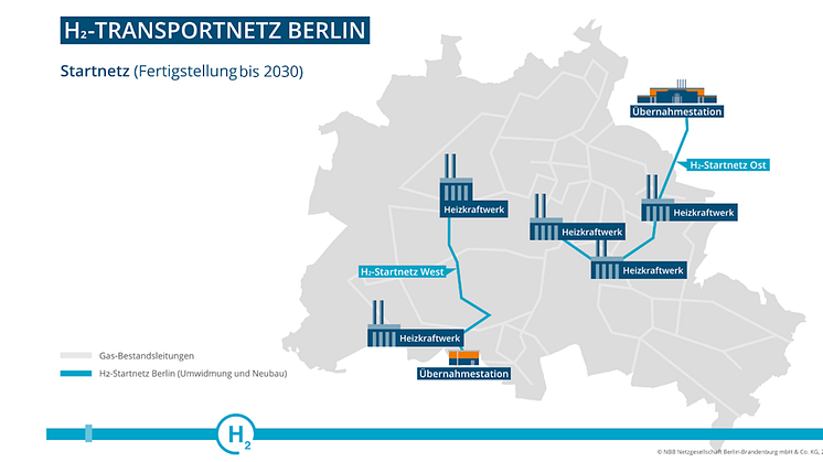 Das Phasenmodell der Unternehmen sieht ein Startnetz vor, das schon 2030 in der Lage ist, fast 50 Prozent des gesamten Berliner Gasverbrauchs durch Wasserstoff zu ersetzen. Die Planung beruht auf der Umstellung bestehender Gasleitungen und geht daher nicht nur mit vergleichsweise geringen Kosten einher, sondern vermeidet auch den Bau neuer Trassen im Berliner Stadtgebiet. So bilden die wichtigsten Trassen des Wasserstoff-Startnetzes Berlin zwei insgesamt 60 Kilometer lange Hochdruckleitungen; eine im Osten und eine im Westen Berlins. Sie sollen den Wasserstoff an Übernahmestationen vom Ferngasnetzbetreiber ONTRAS übernehmen und zu den verschiedenen großen Heizkraftwerken der Vattenfall Wärme in Berlin transportieren. Damit diese Phase umgesetzt werden kann, stimmt sich NBB mit dem Fernwärmeversorger Vattenfall schon darüber ab, welche Heizkraftwerke potenziell zu welchem Zeitpunkt von Erdgas auf Wasserstoff umgestellt werden können.