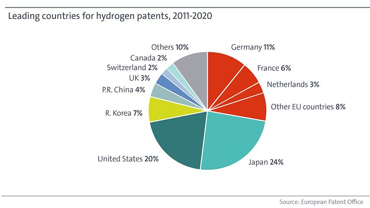 Die Studie zeigt die wichtigsten Trends im Bereich der Wasserstofftechnologien von 2011 bis 2020, gemessen an den internationalen Patentfamilien (IPFs), von denen jede eine hochwertige Erfindung darstellt, für die Patentanmeldungen bei zwei oder mehr Patentämtern weltweit eingereicht wurden. Der Bericht macht deutlich, dass weltweit die EU-Staaten und Japan bei der Patentierung von Wasserstoff führend sind und 28 % bzw. 24 % aller in diesem Zeitraum eingereichten IPFs auf sich vereinen. Beide Regionen konnten in den letzten zehn Jahren ebenfalls ein erhebliches Wachstum vorweisen. Innerhalb der EU führen Deutschland (11 % der weltweiten IPFs), Frankreich (6 %) und die Niederlande (3 %). Dagegen verzeichnen die USA im selben Zeitraum mit 20 % aller wasserstoffbezogenen IPFs als einziger großer Spitzenanmelder einen Rückgang bei den internationalen Wasserstoffpatentanmeldungen. Die internationale Patentaktivität im Bereich der Wasserstofftechnologien aus Südkorea und China bleiben auf einem niedrigeren Niveau, zeigen aber einen aufsteigenden Trend. Neben diesen fünf führenden Innovationsregionen gibt es noch weitere Länder, in denen in erheblichem Umfang Wasserstoffpatente angemeldet werden, darunter das Vereinigte Königreich, die Schweiz und Kanada.