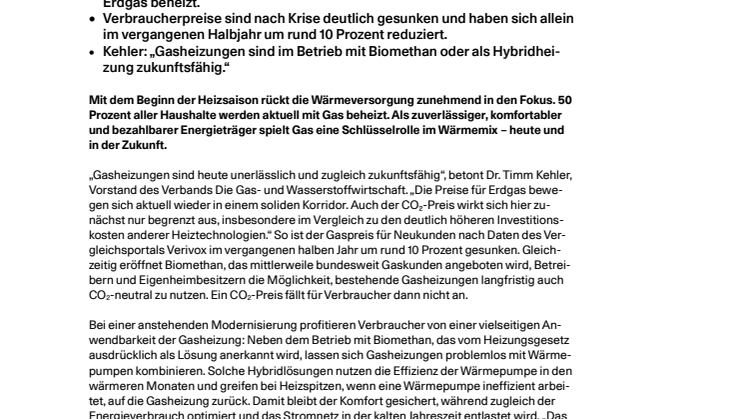 „Gasheizungen sind heute unerlässlich und zugleich zukunftsfähig“, betont Dr. Timm Kehler, Vorstand des Verbands Die Gas- und Wasserstoffwirtschaft. „Die Preise für Erdgas bewegen sich aktuell wieder in einem soliden Korridor. Auch der CO₂-Preis wirkt sich hier zunächst nur begrenzt aus, insbesondere im Vergleich zu den deutlich höheren Investitionskosten anderer Heiztechnologien.“ So ist der Gaspreis für Neukunden nach Daten des Vergleichsportals Verivox im vergangenen halben Jahr um rund 10 Prozent gesunken. Gleichzeitig eröffnet Biomethan, das mittlerweile bundesweit Gaskunden angeboten wird, Betreibern und Eigenheimbesitzern die Möglichkeit, bestehende Gasheizungen langfristig auch CO₂-neutral zu nutzen. Ein CO₂-Preis fällt für Verbraucher dann nicht an.