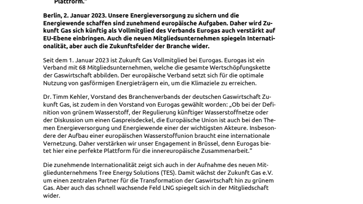 Berlin, 2. Januar 2023. Unsere Energieversorgung zu sichern und die Energiewende schaffen sind zunehmend europäische Aufgaben. Daher wird Zukunft Gas sich künftig als Vollmitglied des Verbands Eurogas auch verstärkt auf EU-Ebene einbringen. Auch die neuen Mitgliedsunternehmen spiegeln Internationalität, aber auch die Zukunftsfelder der Branche wider.