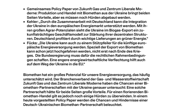 - Gemeinsames Policy Paper von Zukunft Gas und Zentrum Liberale Moderne: Produktion und Handel mit Biomethan aus der Ukraine bringt beiden Seiten Vorteile, aber es müssen noch Hürden abgebaut werden.