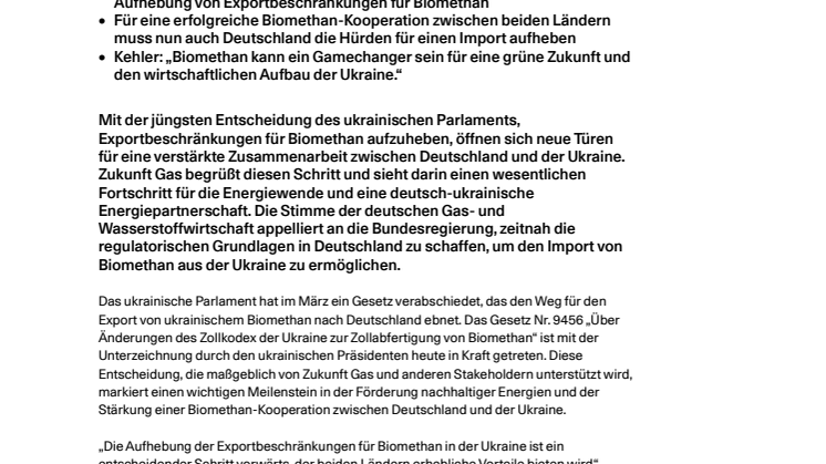 - Zukunft Gas begrüßt die Entscheidung des ukrainischen Parlaments zur Aufhebung von Exportbeschränkungen für Biomethan