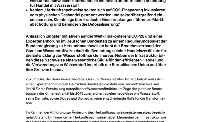Anlässlich jüngster Initiativen auf der Weltklimakonferenz COP28 und einer Expertenanhörung im Deutschen Bundestag zu einem Regulierungspaket der Bundesregierung zu Herkunftsnachweisen hebt der Branchenverband der Gas- und Wasserstoffwirtschaft die Bedeutung solcher Handelszertifikate für die Entwicklung von Wasserstoffmärkten hervor. Neben der Infrastruktur bilden diese Nachweise eine wesentliche Säule für den effizienten Handel und die Verwendung von Wasserstoff innerhalb der Europäischen Union und über ihre Grenzen hinaus.