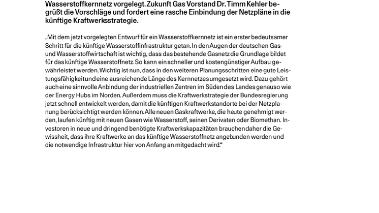 „Mit dem jetzt vorgelegten Entwurf für ein Wasserstoffkernnetz ist ein erster bedeutsamer Schritt für die künftige Wasserstoffinfrastruktur getan. In den Augen der deutschen Gas- und Wasserstoffwirtschaft ist wichtig, dass das bestehende Gasnetz die Grundlage bildet für das künftige Wasserstoffnetz. So kann ein schneller und kostengünstiger Aufbau gewährleistet werden. Wichtig ist nun, dass in den weiteren Planungsschritten eine gute Leistungsfähigkeit und eine ausreichende Länge des Kernnetzes umgesetzt wird. Dazu gehört auch eine sinnvolle Anbindung der industriellen Zentren im Süden des Landes genauso wie der Energy Hubs im Norden. Außerdem muss die Kraftwerkstrategie der Bundesregierung jetzt schnell entwickelt werden, damit die künftigen Kraftwerkstandorte bei der Netzplanung berücksichtigt werden können. Alle neuen Gaskraftwerke, die heute genehmigt werden, laufen künftig mit neuen Gasen wie Wasserstoff, seinen Derivaten oder Biomethan. Investoren in neue und dringend benötigte Kraftwerkskapazitäten brauchen daher die Gewissheit, dass ihre Kraftwerke an das künftige Wasserstoffnetz angebunden werden und die notwendige Infrastruktur hier von Anfang an mitgedacht wird.“