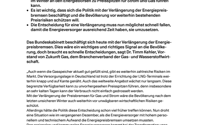Das Bundeskabinett beschäftigt sich heute mit der Verlängerung der Energiepreisbremsen. Dies wäre ein wichtiges und richtiges Signal an die Bevölkerung, doch braucht es schnelle Entscheidungen, sagt Dr. Timm Kehler, Vorstand von Zukunft Gas, dem Branchenverband der Gas- und Wasserstoffwirtschaft.