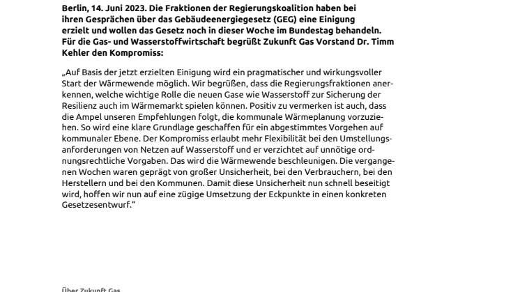 Berlin, 14. Juni 2023. Die Fraktionen der Regierungskoalition haben bei ihren Gesprächen über das Gebäudeenergiegesetz (GEG) eine Einigung erzielt und wollen das Gesetz noch in dieser Woche im Bundestag behandeln. Für die Gas- und Wasserstoffwirtschaft begrüßt Zukunft Gas Vorstand Dr. Timm Kehler den Kompromiss:
