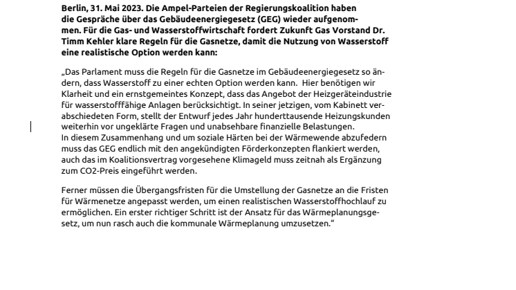 Berlin, 31. Mai 2023. Die Ampel-Parteien der Regierungskoalition haben die Gespräche über das Gebäudeenergiegesetz (GEG) wieder aufgenommen. Für die Gas- und Wasserstoffwirtschaft fordert Zukunft Gas Vorstand Dr. Timm Kehler klare Regeln für die Gasnetze, damit die Nutzung von Wasserstoff eine realistische Option werden kann: