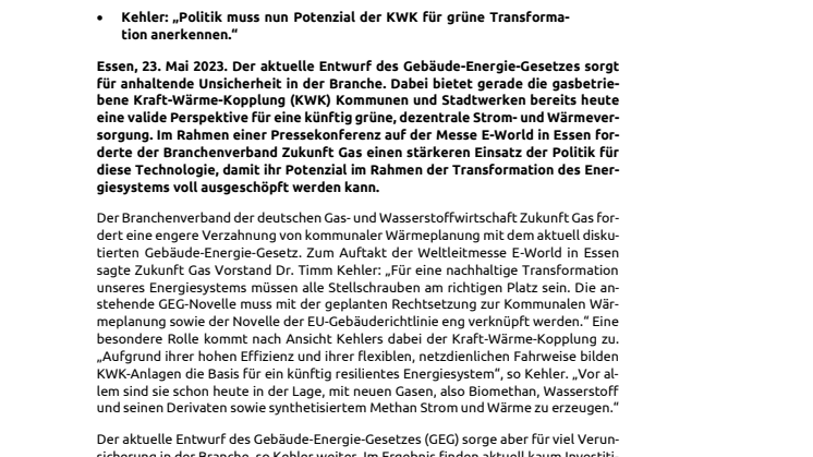 Essen, 23. Mai 2023. Der aktuelle Entwurf des Gebäude-Energie-Gesetzes sorgt für anhaltende Unsicherheit in der Branche. Dabei bietet gerade die gasbetriebene Kraft-Wärme-Kopplung (KWK) Kommunen und Stadtwerken bereits heute eine valide Perspektive für eine künftig grüne, dezentrale Strom- und Wärmeversorgung. Im Rahmen einer Pressekonferenz auf der Messe E-World in Essen forderte der Branchenverband Zukunft Gas einen stärkeren Einsatz der Politik für diese Technologie, damit ihr Potenzial im Rahmen der Transformation des Energiesystems voll ausgeschöpft werden kann.