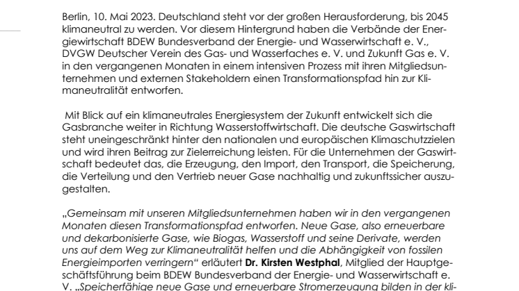 Berlin, 10. Mai 2023. Deutschland steht vor der großen Herausforderung, bis 2045 klimaneutral zu werden. Vor diesem Hintergrund haben die Verbände der Energiewirtschaft BDEW Bundesverband der Energie- und Wasserwirtschaft e. V., DVGW Deutscher Verein des Gas- und Wasserfaches e. V. und Zukunft Gas e. V. in den vergangenen Monaten in einem intensiven Prozess mit ihren Mitgliedsunternehmen und externen Stakeholdern einen Transformationspfad hin zur Klimaneutralität entworfen.